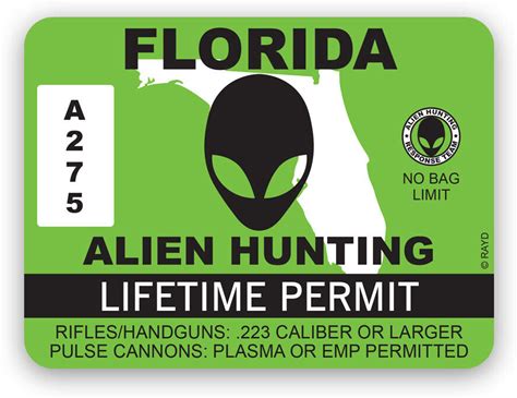 Florida Alien Hunting Permit Sticker Weatherproof Ufo Aliens Hunter Fl. Darkside Ltd. Decals & Vinyls.